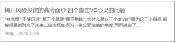 如揭开风险投资的高冷面纱:四个直击VC心灵的问题 (如下图 )—文中,作者将风险投资行业的一些信息进行拆解,并向读者和盘托出,这种"泄密"抓住了读者内心想要了解更多真相的愿望,起到了强大的吸引作用。