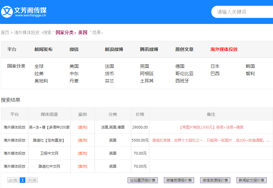 如果你想在英国投放软文广告那肯定是选择英国的媒体,比如路透社,卫报中文网等媒体才能发挥最大的广告价值,如果您没有合适的发稿渠道,可以选择文芳阁传媒,文芳阁海外软文营销推广平台拥有全球媒体的网络资源,可的北美、欧洲、拉美、大洋洲、非洲、中东等全球200多个国家为品牌广告主提供海外软文发布、海外中文媒体投放外贸广告等传播服务。