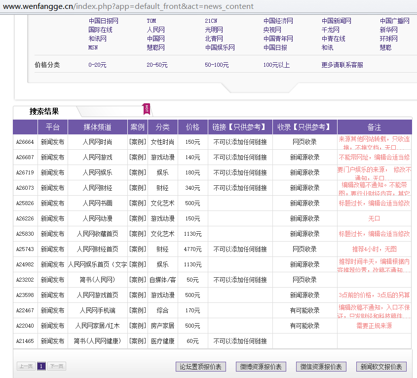 人民网各个频道发稿收费如下: