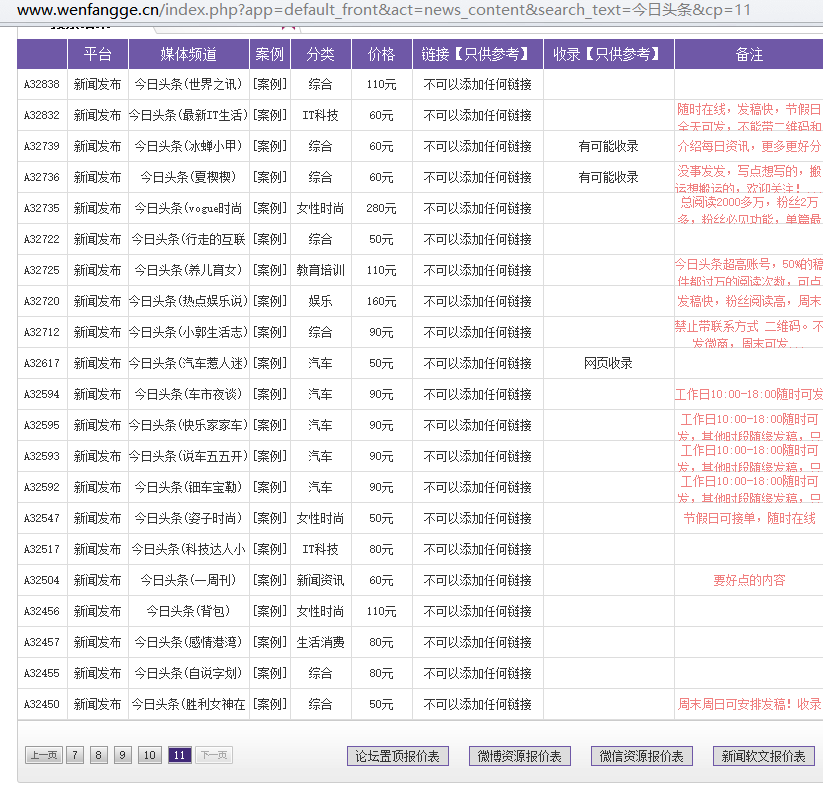 自媒体时代的到来,让信息的传播形式逐渐发生改变,电视、报纸不再是我们获取信息的重要渠道,品牌的传播形式也变得不再单一,以软文发布为主的营销更是能以四两达到拨千斤的网络营销效果。那么你知道怎么发表今日头条吗?今日头条投稿邮箱是多少吗?如果没有好的方法在今日头条上发稿,不妨与文芳阁传媒m.ftslqw.cn类似的传媒公司合作吧,文芳阁在2015年集中技术收集了大量的今日头条发稿资源,如下: